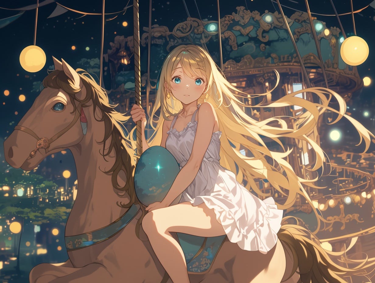 我透過頭套嘴巴位置的洞兒,發現外面不像是舞台。一些穿著古代軍服的士兵,坐在馬背上奔馳,手中揮舞著刀劍。但他們都保持著固定的距離,劍刃無法觸及對方。而且,他們坐的馬都有規律地上上下下地移動。我感到地板在轉動,令我差點站不穩。原來我置身於舊式遊樂場的旋轉木馬之間。笨重的頭套令我無法低頭檢視自己的狀況,只能用手去確認自己還是全身赤裸。