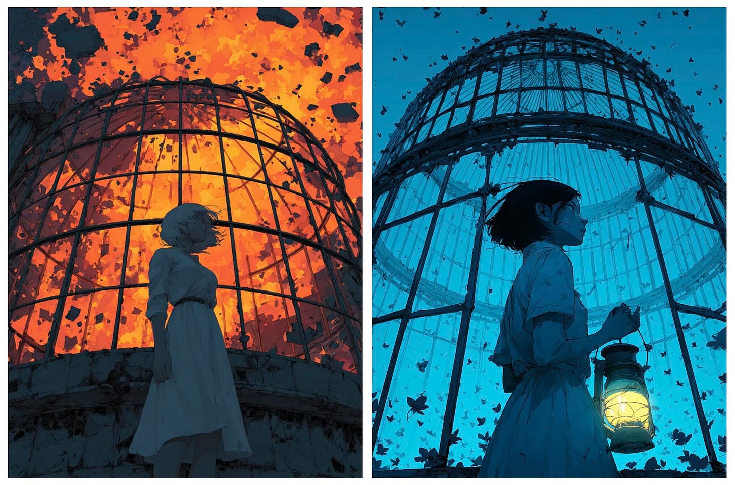 我和黑坐在觀眾席中央,沒有其他觀眾。黑穿著整套黑色禮服,頭戴黑色禮帽,腳踏鮮紅色高跟鞋,臉上像化了妝似的煞白,唯嘴唇色澤血紅。我穿著平常的普通白色 T 恤和牛仔裙。