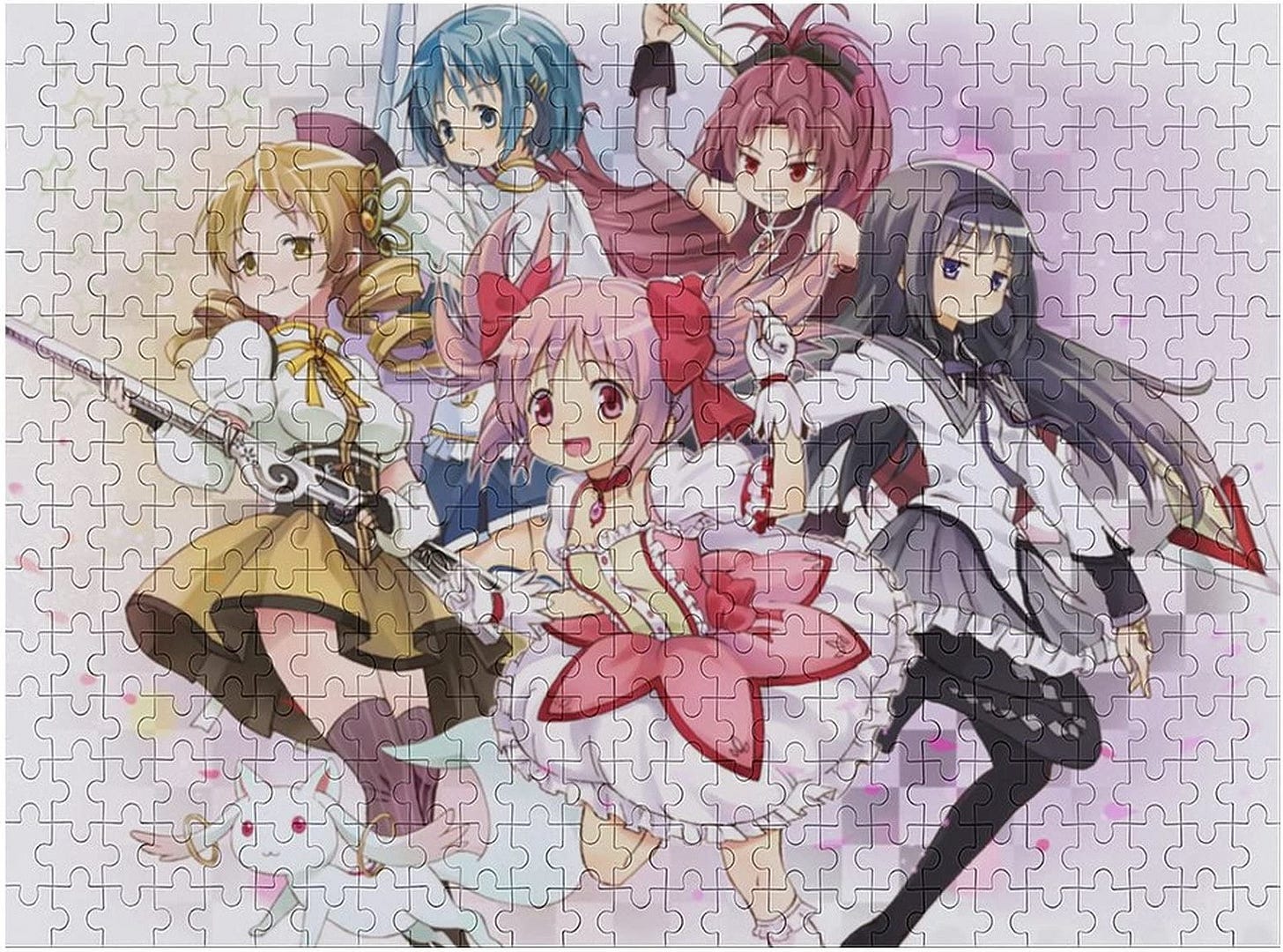 我打開盒子,把拼圖倒出來。這幅塊數不多,不會花太多時間。小圓很好奇地跟著我撿起拼圖,慢慢地拼了起來。圖中有五個魔法少女——鹿目圓、曉美焰、美樹沙耶香、巴麻美和佐倉杏子,還有既可愛又邪惡的丘比。
