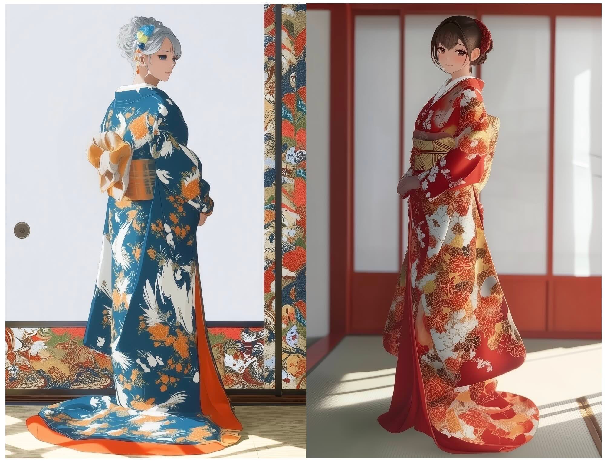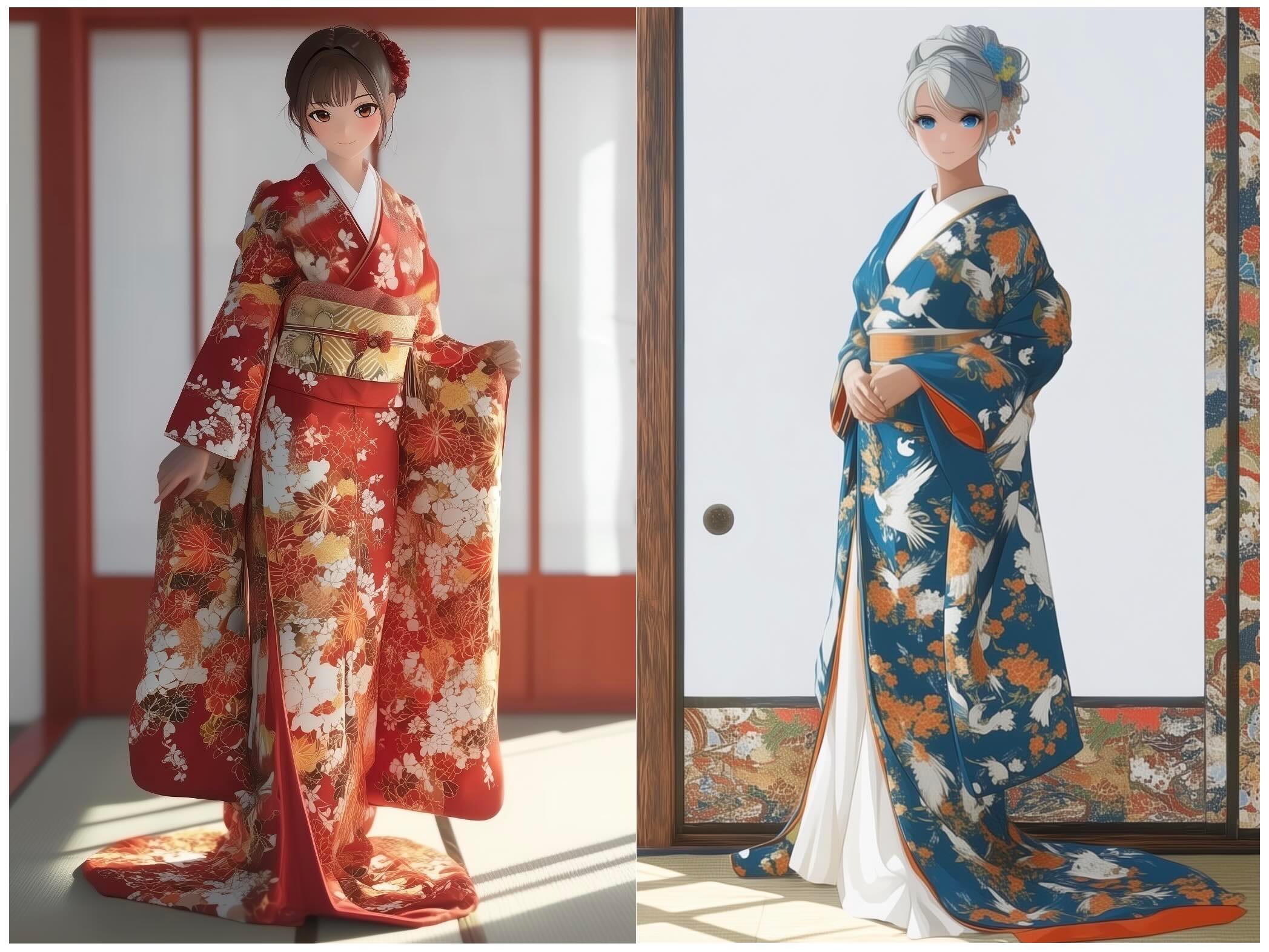 吃了早餐便出發去和服租借公司,換裝拍照。姐們曾經考慮過穿白無垢,但那代表女性去除自我,準備沾染夫家色彩,覺得不是很認同,便改為穿色打掛。色打掛的款式很多,都非常華麗。庭音姐穿的是正統的深藍色底白鶴和紅白梅花樣式,優雅又有氣度,幸晨姐穿的是豔麗的大紅色底四季花卉樣式,熱情又活潑。我和蔓穿中振袖,是未婚女性出席宴會的和服。