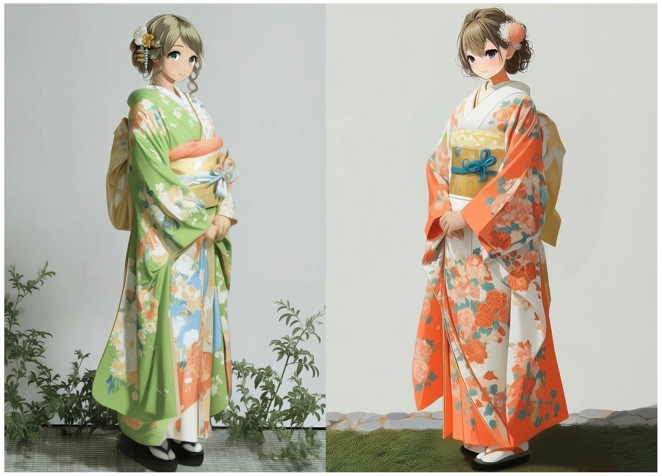 聽寶兒說很多和服公司也不接受孕婦租用,但她安排了一家可以彈性處理的,會因應我的情況來穿衣。我的肚子其實也不算很大,只要腰帶稍鬆一點便可以。我選的是淺粉紅底色和橙色邊的百花樣式振䄂,看來年輕可愛。蔓選的是比較少見的淺綠色有白花和波紋樣式的振䄂,很清新怡人,跟她非常合襯。兩位師傅輪流幫我們穿衣,另外還有兩位化妝師,再加專車接送服務,這樣的陣仗肯定花費不少。晨爸爸為女兒的婚事真是一擲千金,還惠及我們這些伴娘。